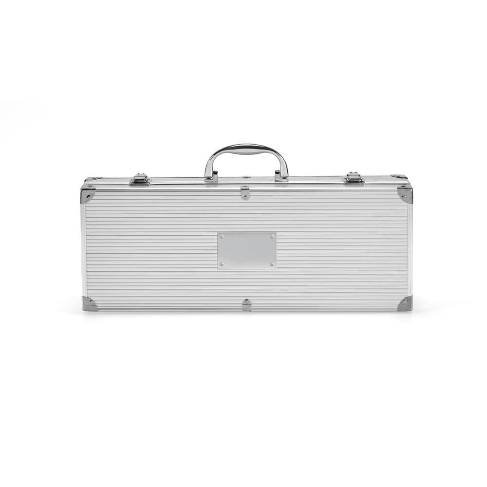 Kit churrasco em estojo de alumínio. Composto por luva de cozinha em poliéster e 6 utensílios em aço inox: faca chefe, 1 faca japonesa, 1 pinça, 1 garfo, 1 espátula e 1 afiador. Certificação EU Food Grade. Estojo: 450 x 170 x 80 mm | Placa: 80 x 50 mm