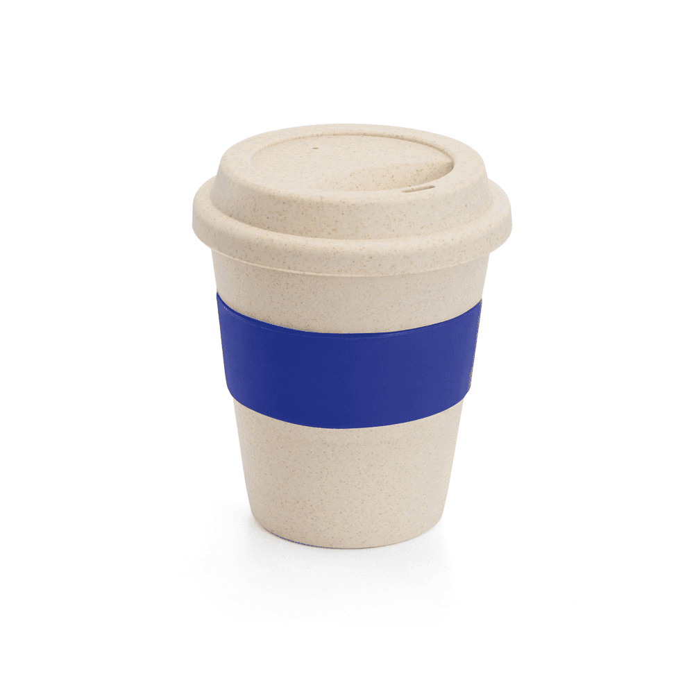Copo de viagem em fibra de bambu (60%) e PP (40%) com tampa. Tira em silicone para facilitar o transporte de bebidas quentes. Capacidade até 380 mL Certificação EU Food Grade. ø95 x 114 mm