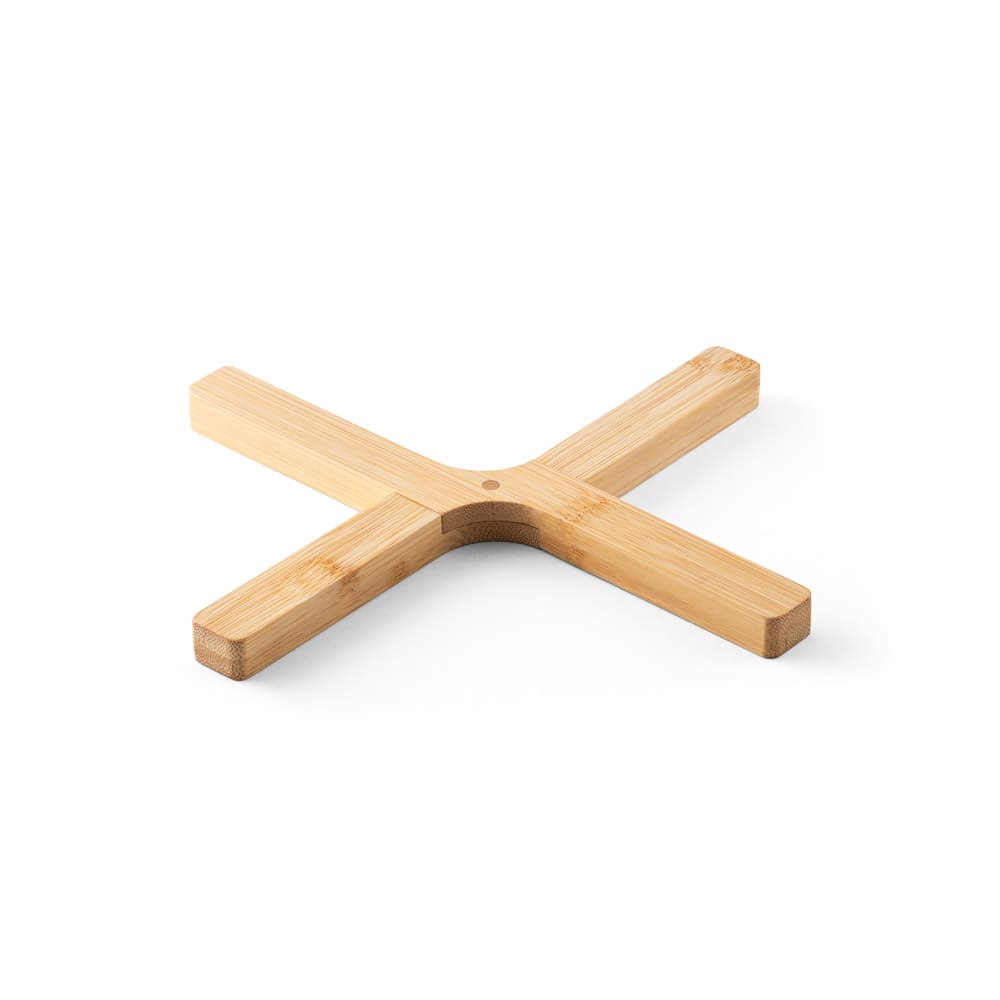 Descanso de panela dobrável em bambu. Fornecido em caixa oferta em papel kraft reciclado. A cor e o resultado da impressão nos materiais naturais pode variar entre produtos. Fechado: 215 x 40 x 14 mm | Aberto: 180 x 150 x 14 mm