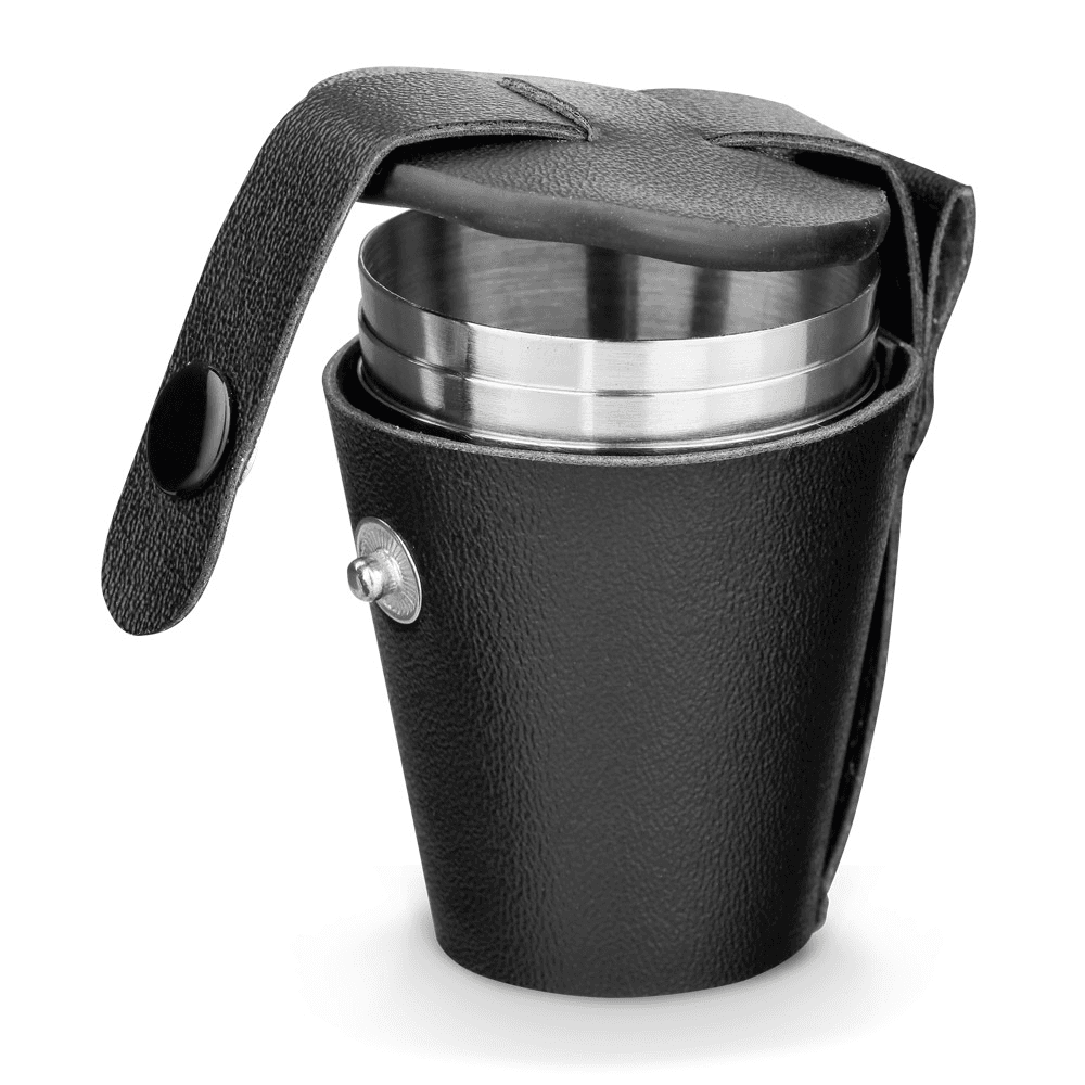 Conjunto de 4 copos em aço inox com bolsa para transporte em PU, copo com capacidade até 25 mL. Fornecido em caixa presente. Certificação EU Food Grade. ø44 x 62 mm