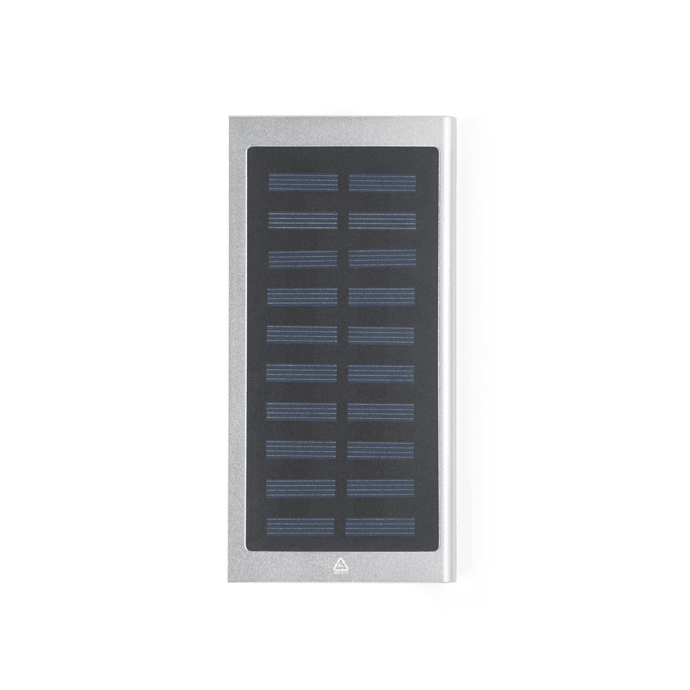 Bateria portátil em alumínio 100% reciclado. Bateria em lítio, com painel solar monocristalino e lanterna. Tem capacidade de 8.000 mAh e tempo de vida superior a 500 ciclos. Possui uma porta de entrada USB-C e duas portas de saída USB-A. Incluso cabo USB-C para carregamento com cerca de 30 cm. Ideal para situações de emergência. Fornecido em caixa presente de papel kraft reciclado. 10 x 153 x 74 mm