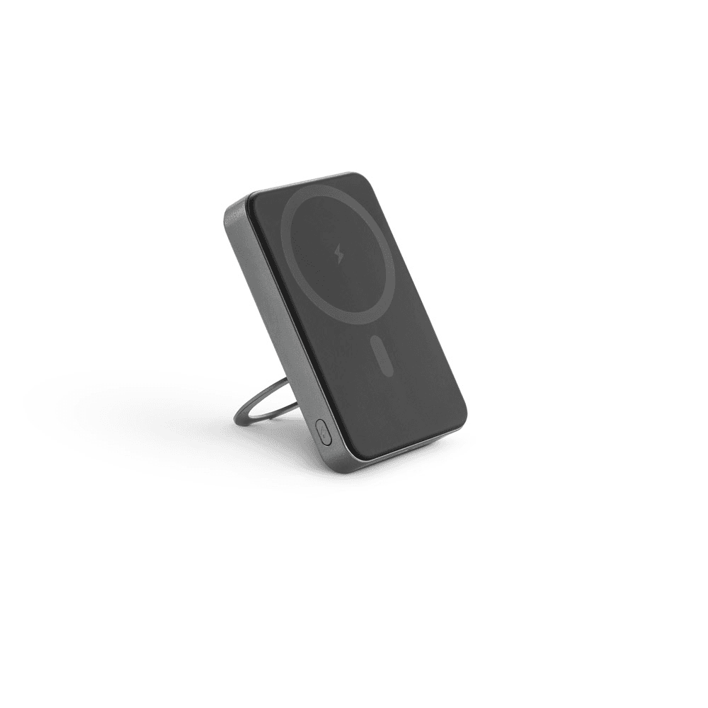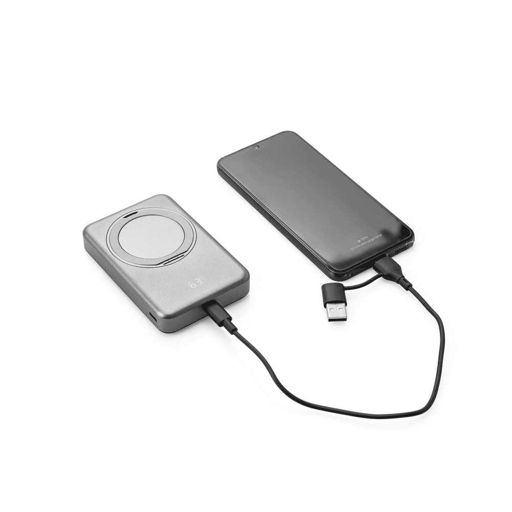 Bateria portátil magnética em ABS 100% reciclado, com carregador por indução (wireless) super-rápido. Graças à capacidade magnética e carregamento sem fios, é fácil de fixar ao seu dispositivo móvel. A argola de suporte permite adaptar a posição para colocar o dispositivo móvel na vertical ou horizontal e ajustar a inclinação. Apresenta uma capacidade de 10.000 mAh, duas portas de entrada/saída USB-C com carregamento rápido PD 20W e potência máxima de 15W para carregamento super-rápido sem fios. Compatível com dispositivos móveis com tecnologia de carregamento sem fios. Incluso um cabo de carregamento rápido de saída dupla USB-A/USB-C e um grip magnético extra para os smartphones que não têm a função magnética. Fornecida em caixa presente de papel kraft reciclado. 105 x 69 x 17 mm | Caixa: 110 x 95 x 20 mm