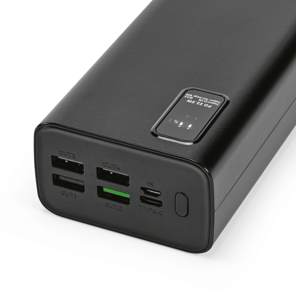 Bateria portátil em ABS 100% reciclado. Bateria em lítio com capacidade de 30.000 mAh e tempo de vida ≥ 300 ciclos. Possui entrada micro-USB e USB-C, 4 saídas USB-A e uma saída USB-C. A parte frontal tem uma tela de LED com informações do nível de carga da bateria. Incluso cabo USB-C para carregamento da bateria. Fornecida em caixa presente de papel kraft reciclado. 143 x 69 x 41 mm | Caixa: 75 x 150 x 45 mm