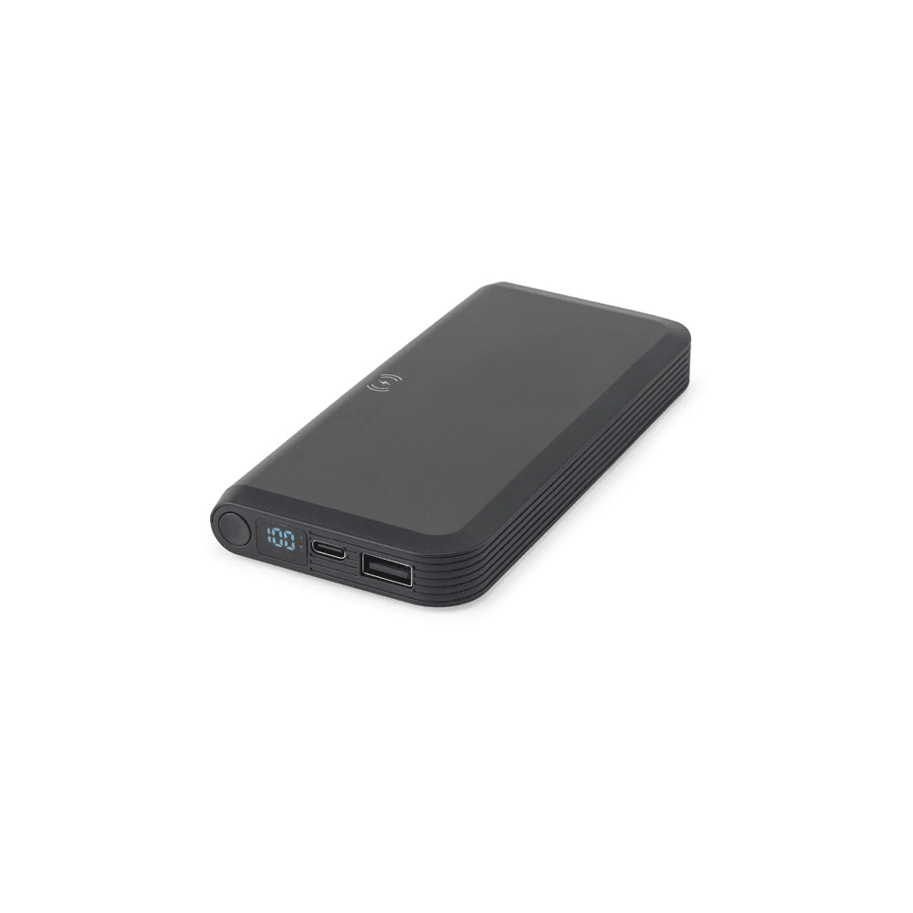 Bateria portátil com carregador por indução (wireless) em ABS 100% reciclado, com capacidade de 10.000 mAh e tela indicadora de nível de carga. A power bank tem uma porta de entrada/saída USB-C e uma porta de saída USB, ambas de carregamento rápido PD 20W. O carregador wireless tem uma potência máxima de 15W. Incluso um cabo de carregamento com saída dupla USB-A/USB-C. Compatível com dispositivos móveis com tecnologia de carregamento sem fios. Fornecida em caixa presente de papel kraft reciclado. 141 x 69 x 17 mm | Caixa: 146 x 95 x 20 mm