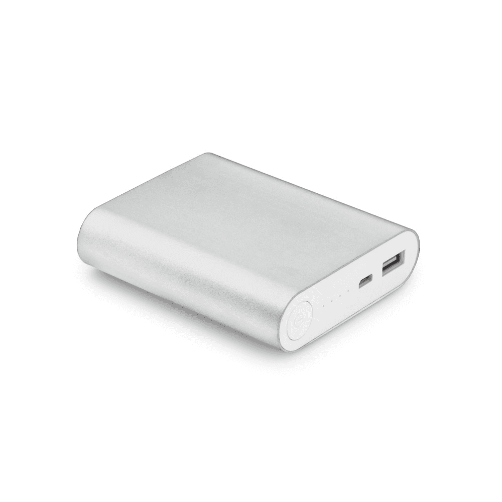 Bateria portátil em alumínio. Bateria de lítio com capacidade de 8.000 mAh, tempo de vida ≥ 500 ciclos e com porta de saída USB-A. Incluso cabo USB-C para carregar a bateria. Fornecida em caixa presente de papel kraft reciclado. 90 x 77 x 22 mm | Caixa: 110 x 85 x 25 mm