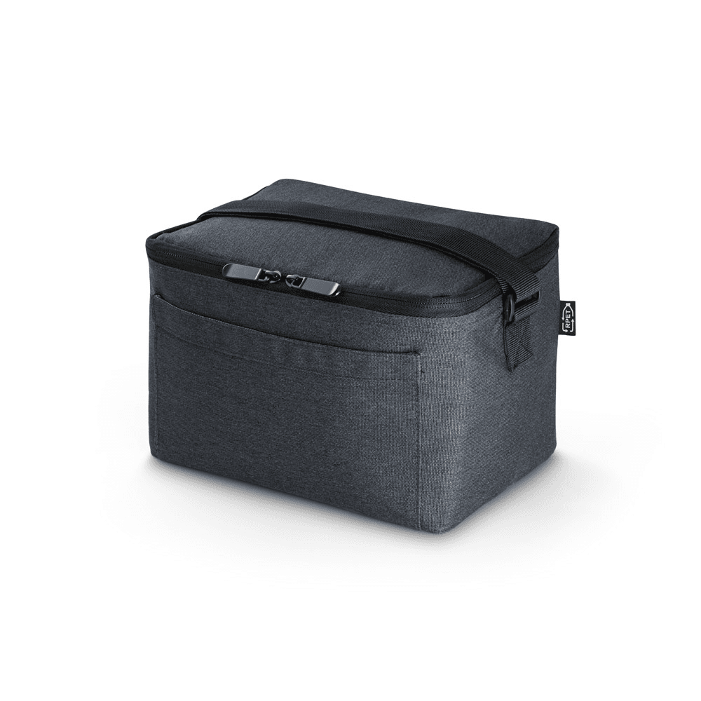 Bolsa térmica em poliéster reciclado 600D com interior em PEVA. Alça ajustável em webbing, bolso frontal e fecho duplo. Capacidade até 6 L. Certificação EU Food Grade. 240 x 170 x 170 mm