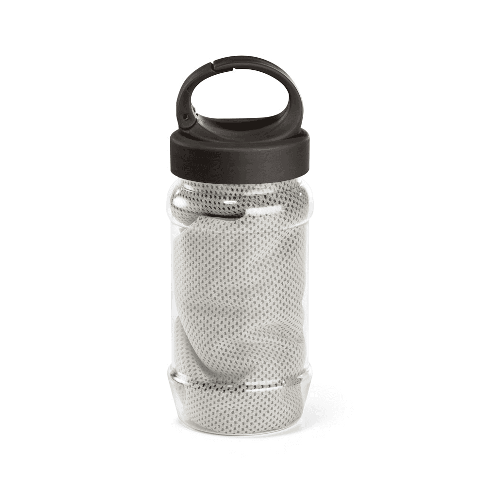 Conjunto composto por uma toalha e garrafa. A toalha para esporte, em poliamida e poliéster, quando molhada permanece fria durante horas. Se aquecer, basta balançar reativando sua frescura. Reutilizável e lavável à máquina. Garrafa em PP e PET com mosquetão incluso. Capacidade até 440 mL. Caixa branca 94653 vendida opcionalmente. Certificação EU Food Grade. Toalha: 300 x 800 mm | Garrafa: ø65 x 183 mm