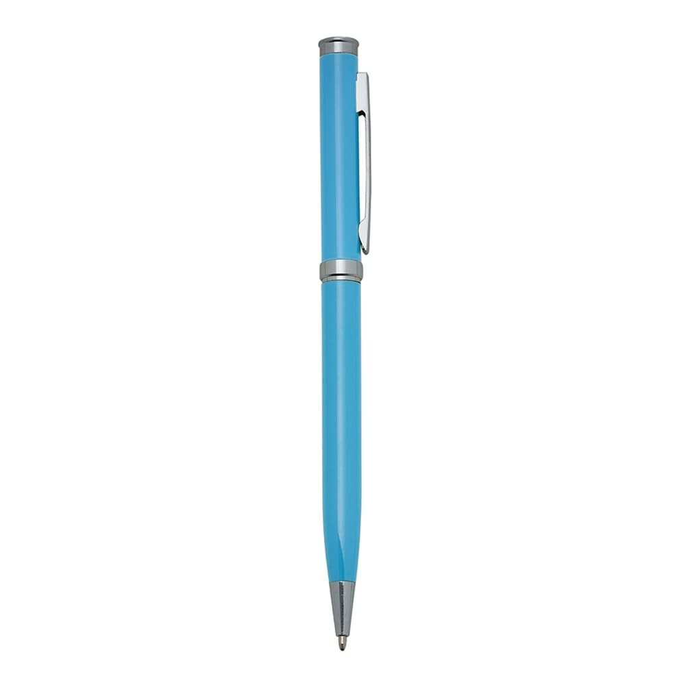 Caneta metálica com carga esferográfica azul 1.0 mm e acionamento por rotação.