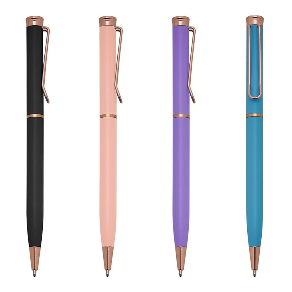 Caneta metálica com carga esferográfica azul 1.0 mm e acionamento por rotação.