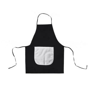Avental adulto preto com bolso branco para sublimação em tecido Oxford poliéster.