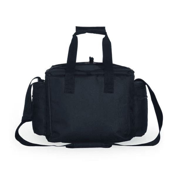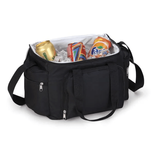 Bolsa Térmica preta em Polyester 600D, 300D e PEVA. Conta com alças de mão, alça de ombro, bolso frontal com zíper, dois bolsos laterais com zíper, elástico superior trançado. Forro interno branco soldado (não vaza) feito de PEVA, atóxico e mais sustentável que o PVC. Tempo de Conservação aproximado: Frio 10 horas / Quente 3 horas.