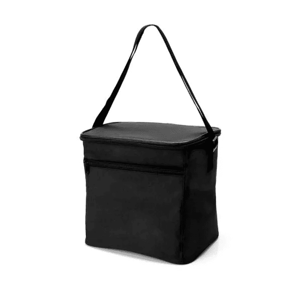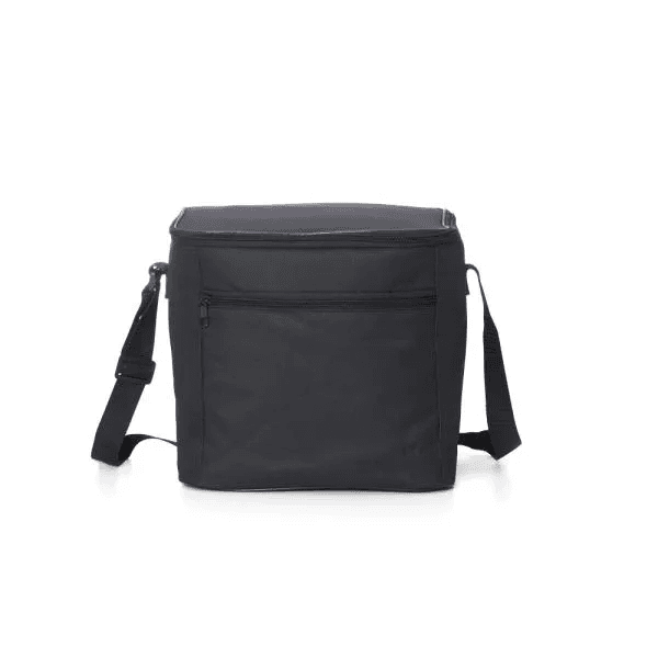 Bolsa Térmica preta em Polyester 600D, 300D e PEVA. Conta com alças de mão, tampa com zíper duplo cursor e bolso frontal com zíper. Forro interno soldado (não vaza) feito de PEVA. Tempo de Conservação aproximado: Frio 10 horas / Quente 3 horas.