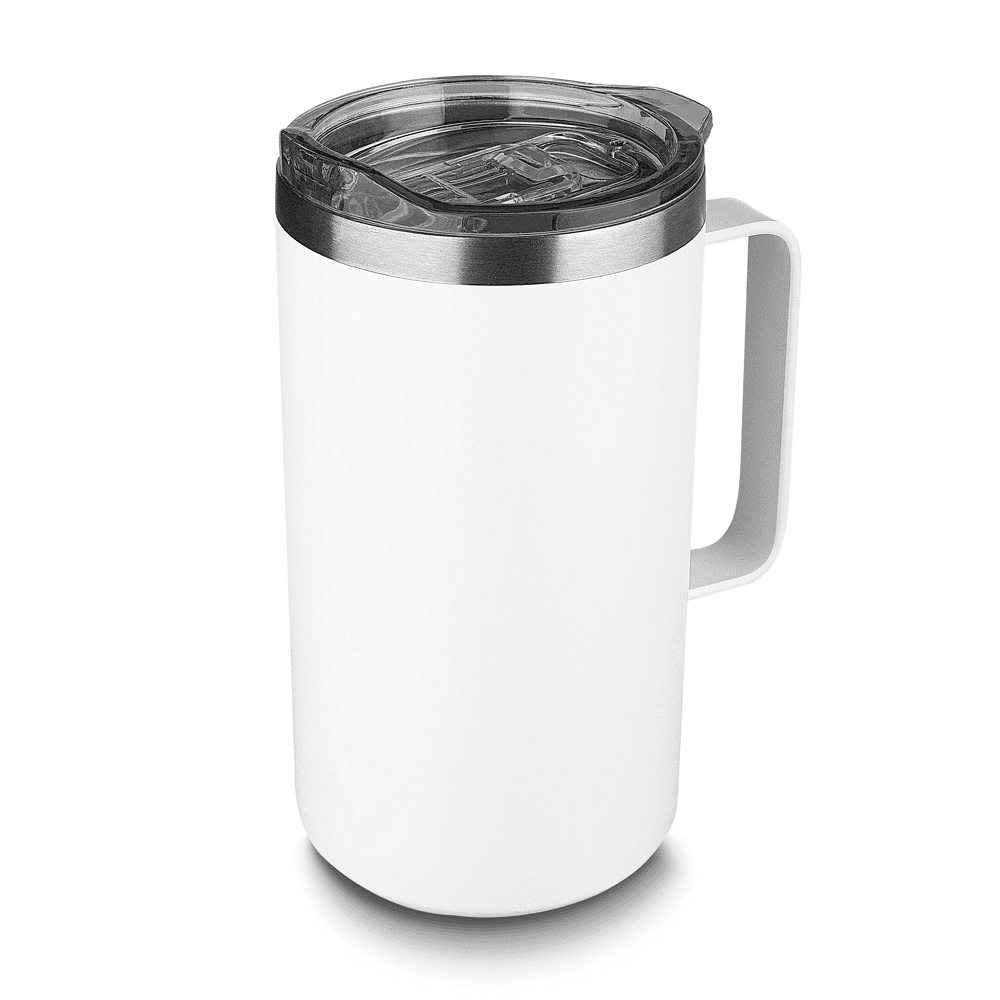 Caneca térmica em aço inox com parede dupla isolada à vácuo, tampa plástica e anel em silicone para vedação, alça lateral. Capacidade 750ml, parede externa com pintura a pó.