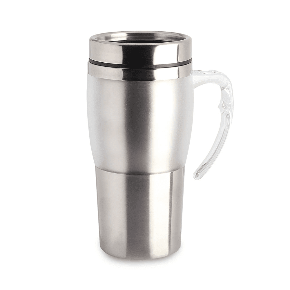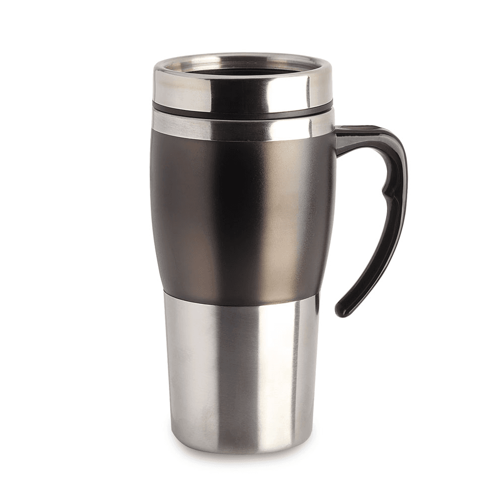 Caneca em aço inox com detalhe plástico colorido, alça na cor do produto. Pintura: corpo escovado, detalhe plástico com pintura fosca. Capacidade: 400ml