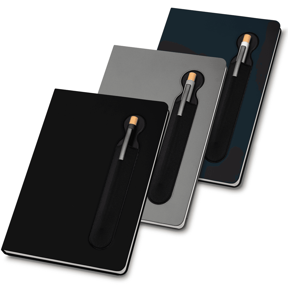 Caderno de anotações com suporte para caneta, capa dura em PU, miolo 80 folhas pautadas na cor bege. NÃO ACOMPANHA CANETA.