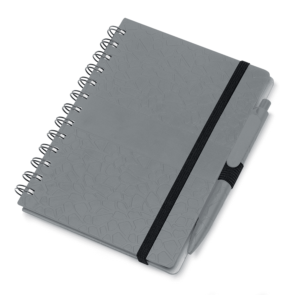 Caderno de anotações em ABS reciclável com aspiral e suporte para caneta. Com capa dura e textura que imita ''pedra'', suas folhas são impermeáveis e resistentes a rasgos, miolo com 70 folhas pautadas na cor branca. Acompanha caneta plástica com textura imitando pedra.