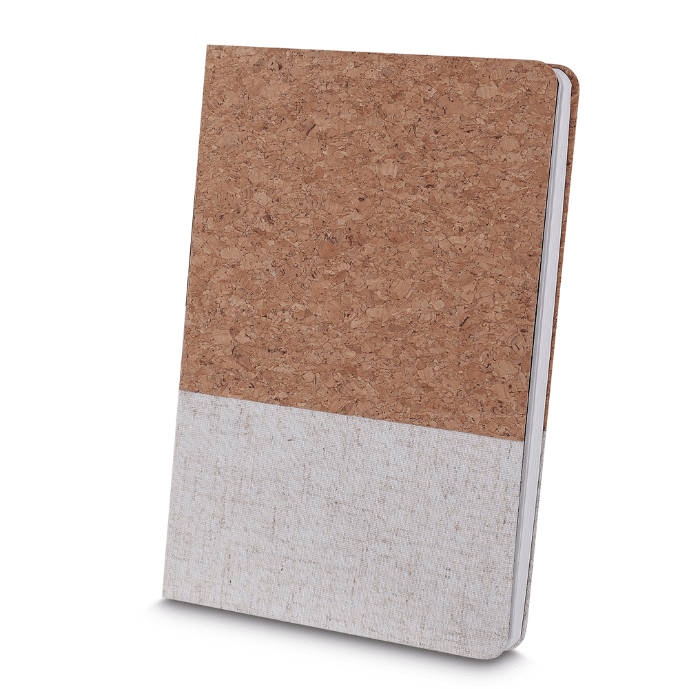 O caderno de anotações é feito de cortiça com detalhe em algodão cru, em capa dura com miolo 80 folhas pautadas.