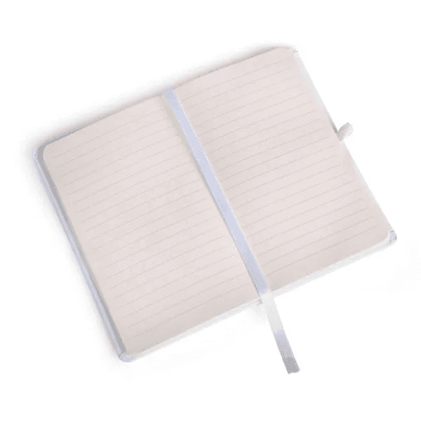 Caderno para anotações branco com capa dura. Conta com 80 folhas pautadas, marcador de página, porta caneta e elástico para fechamento. Gramatura da folha de 70 g/m2.