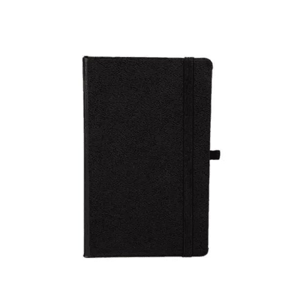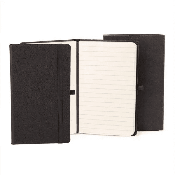 Caderno para anotações preto com capa dura. Conta com 80 folhas pautadas, marcador de página, porta caneta e elástico para fechamento. Gramatura da folha de 70 g/m2.
