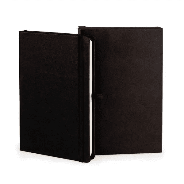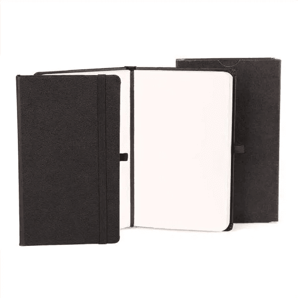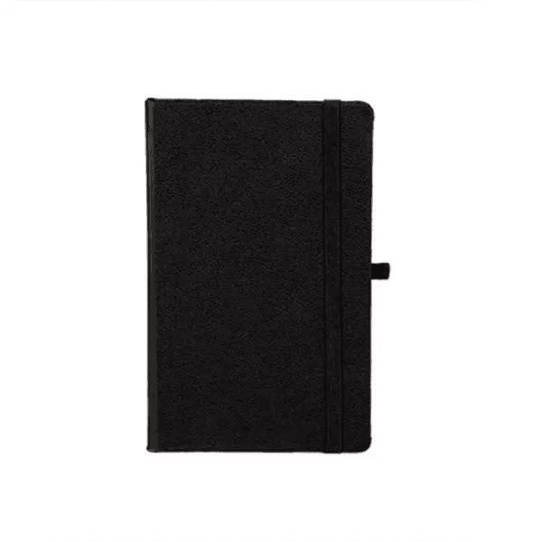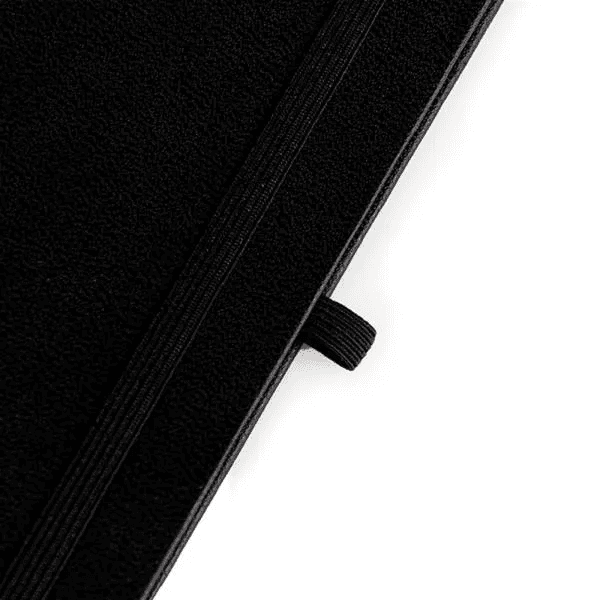 Caderno para anotações preto com capa dura. Conta com 80 folhas não pautadas, marcador de página, porta caneta e elástico para fechamento. Gramatura da folha de 70 g/m2.