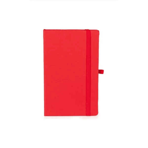 Caderno para anotações vermelho com capa dura. Conta com 80 folhas não pautadas, marcador de página, porta caneta e elástico para fechamento. Gramatura da folha de 70 g/m2.