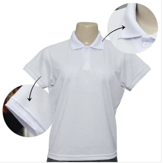 Camisa polo branca, para sublimação em tecido 100% poliéster com tecnologia toque dry. Fabricação própria. Gramatura 190