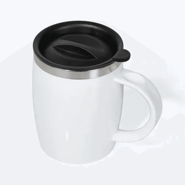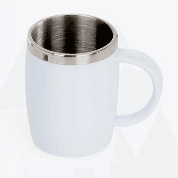 Caneca em Aço Inox com revestimento de Poliestireno branco e tampa em Polipropileno. Capacidade: 400 ml