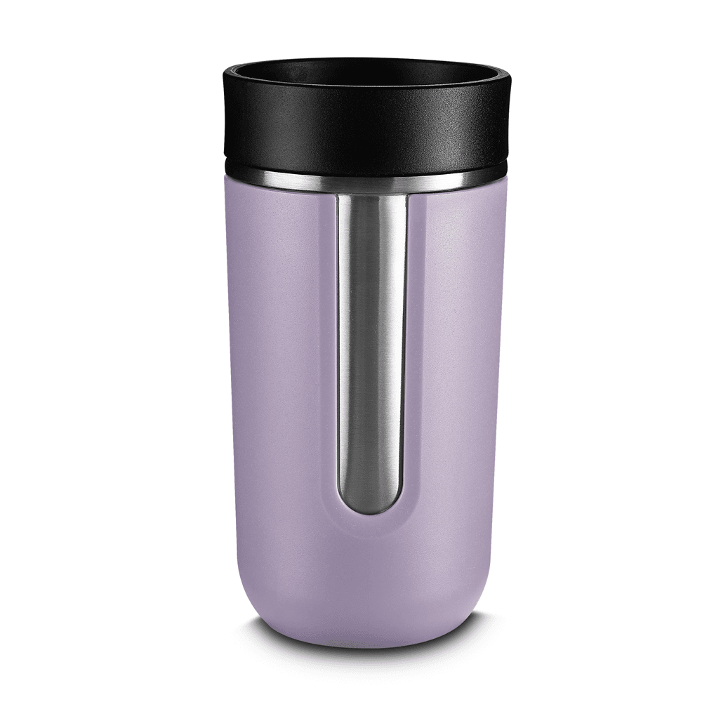 Copo térmico com parede dupla em aço inox e detalhe em plástico,capacidade de 350ml, tampa plástica com sistema antivazamento e botão para habilitar o fluxo de líquido.