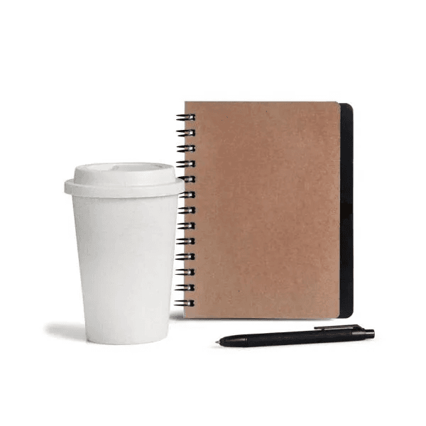 Esse kit conta com caderno com 100 folhas brancas pautadas, espiral wire-o, caneta e copo em Fibra de Bambu / PP.