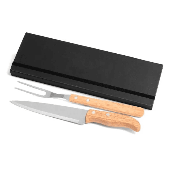 Conjunto composto por uma faca 7” e um garfo trinchante, ambos com cabos em madeira e lâminas em aço Inox. Estão organizados em uma pasta preta com elásticos.