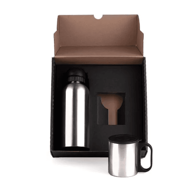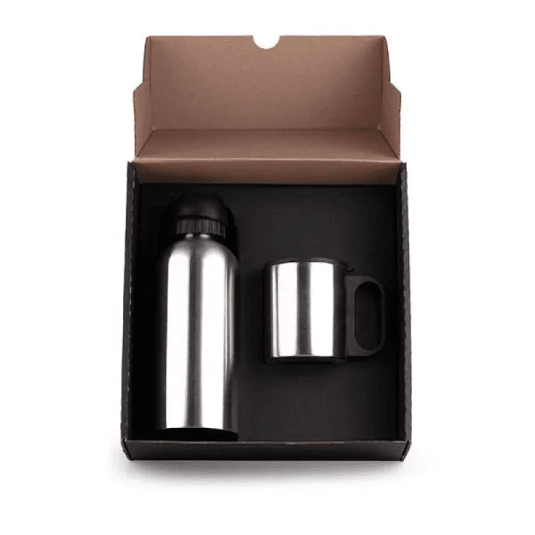 Conjunto de garrafa e caneca em Aço Inox. Garrafa confeccionado em aço inox escovado. Conta com tampa abre e fecha em polipropileno rosqueável e anel interno em silicone para vedação. Caneca em aço inox escovado. Conta com tampa preta e alça em plástico.
