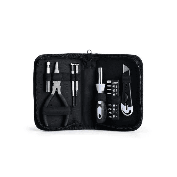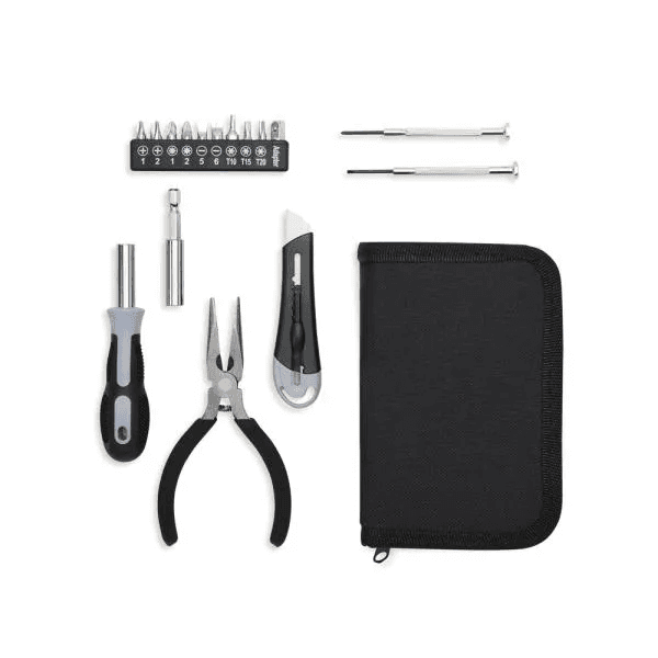 Conjunto de ferramentas. Conta com alicate de bico; chave com dez peças de ponteiras + extensor, sendo quatro phillips, duas fendas, três torx e adaptador; duas chaves de precisão, sendo uma phillips e uma fenda; estilete 1,85"; estojo em nylon com fechamento em zíper.