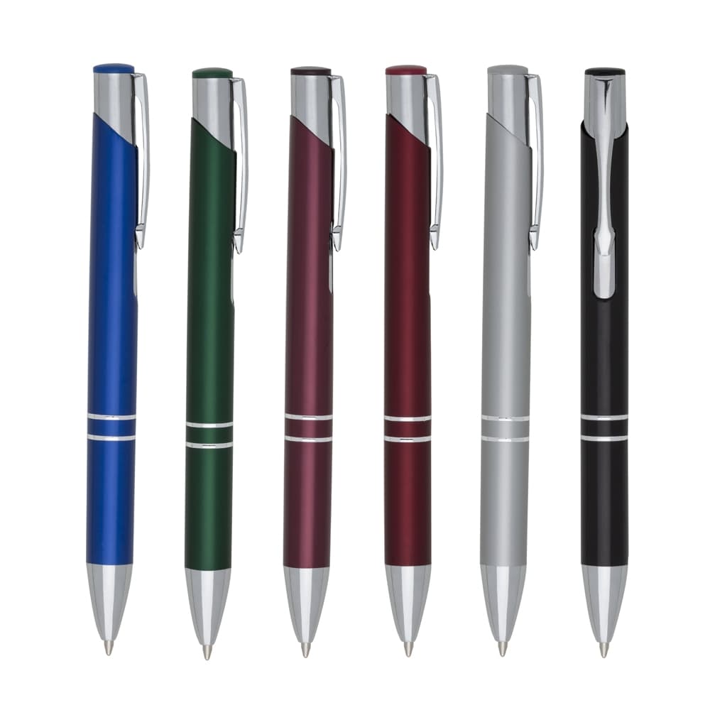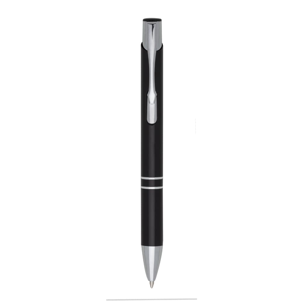 Caneta metálica com carga esferográfica azul 1.0mm e acionamento por clique.