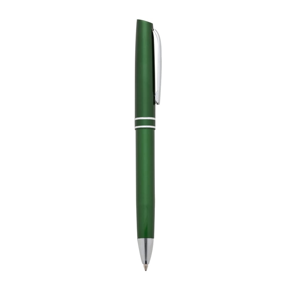 Caneta semimetálica, carga esferográfica azul e acionamento por clique.