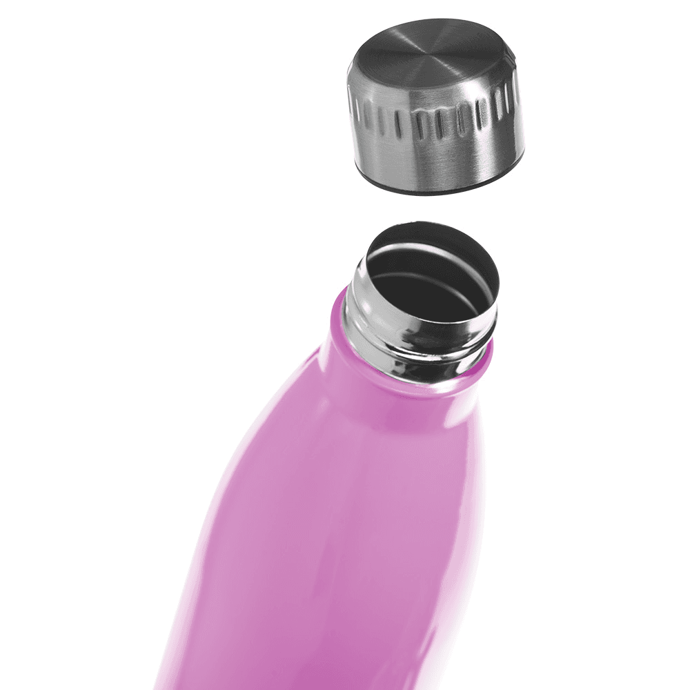 Garrafa em aço inox com capacidade de até 750 ml. Tampa rosqueável e anel de silicone para vedação. Design com frisos na tampa.