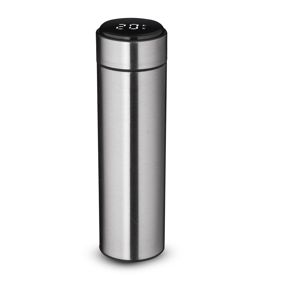Display LED com termômetro digital na tampa para indicar a temperatura do líquido. Possui tampa removível para a troca da bateria CR2032.