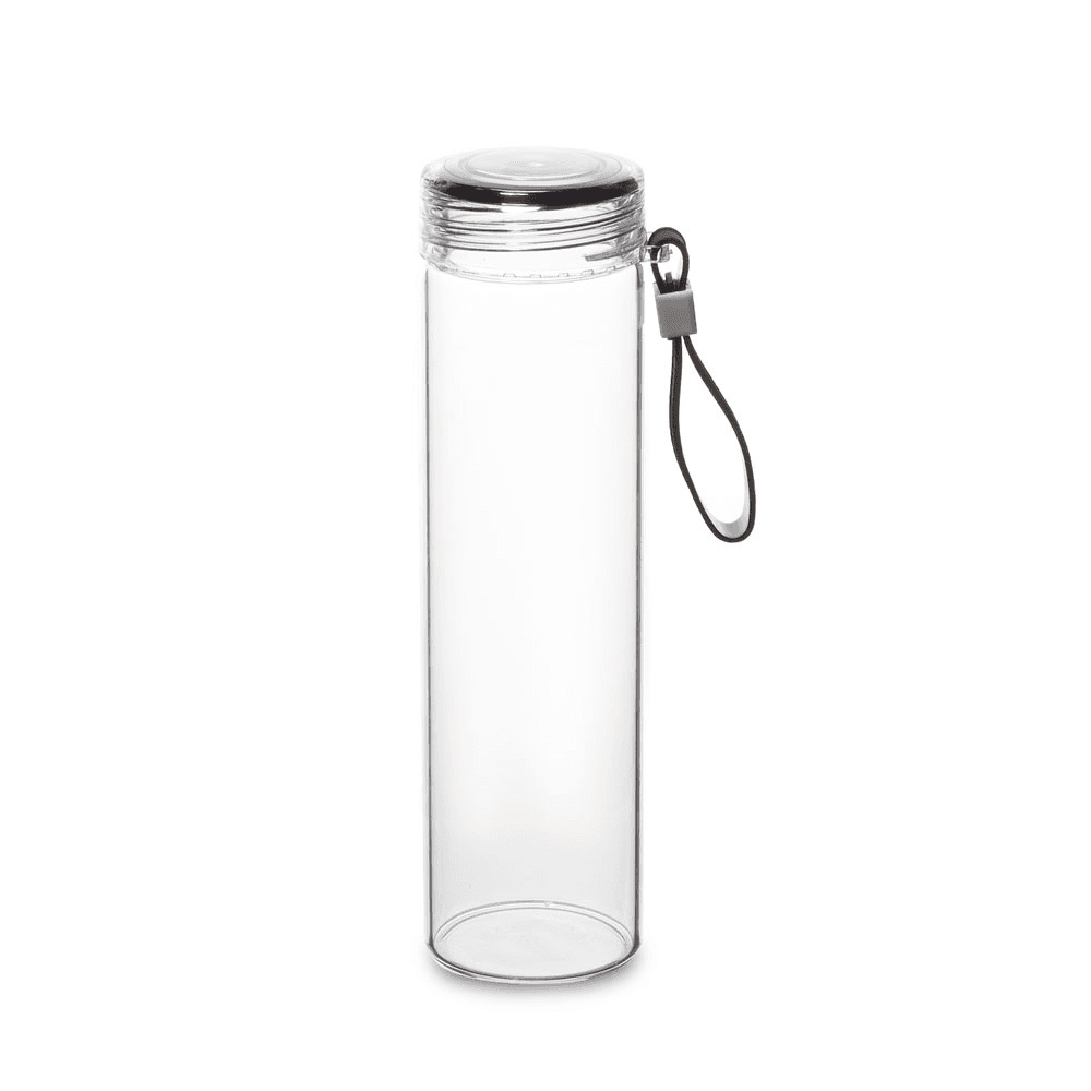 Garrafa em vidro borossilicato com capacidade de 400ml. Alça de transporte em silicone. Tampa de plástico rosqueável com anel de silicone.