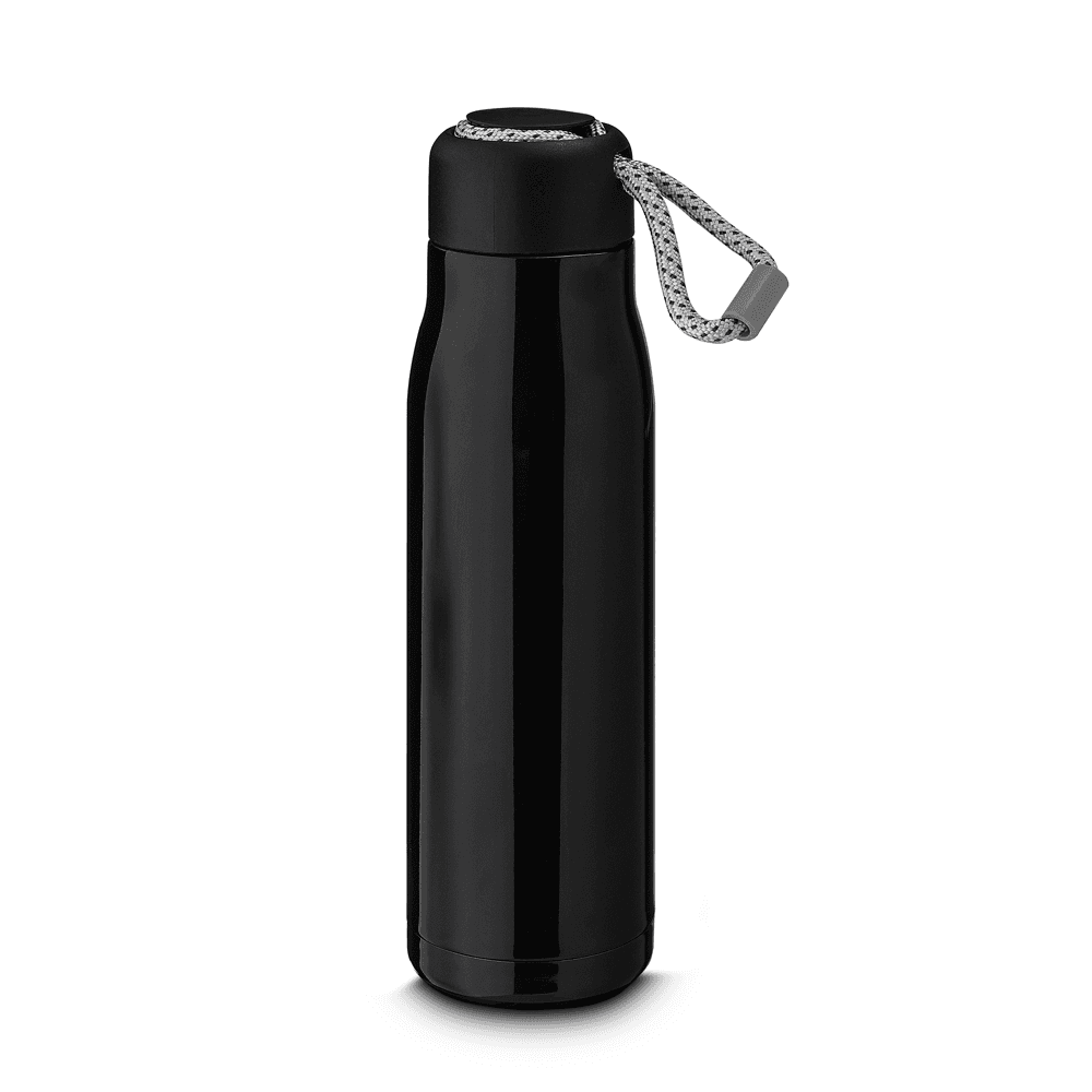 Garrafa térmica em aço inox brilhoso com parede dupla isolada a vácuo, com capacidade de até 550ml. Alça de transporte em corda. Tampa plástica rosqueável com anel de silicone para vedação.