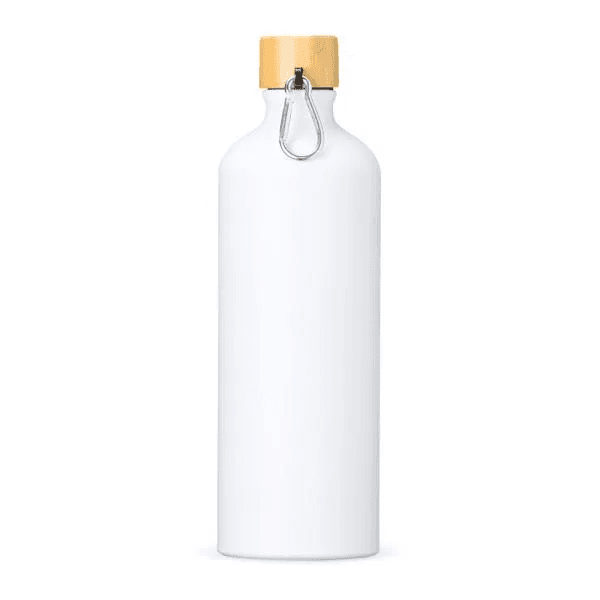 Garrafa em alumínio na cor branca com capacidade de 1 litro. Possui tampa rosqueável em Bambu com mosquetão.