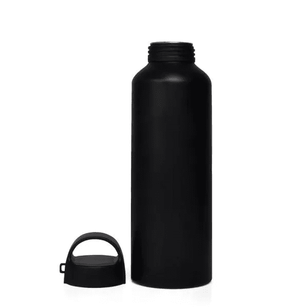 Garrafa em alumínio preto. Conta com tampa plástica rosqueável preta com alça. Capacidade: 600ml
