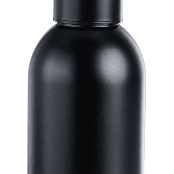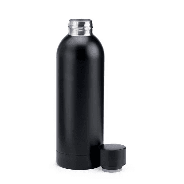 Garrafa em Inox na cor preta, confeccionada com uma segunda parede de Inox para alta preservação de temperatura tanto de líquidos gelados, quanto de líquidos quentes.