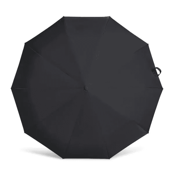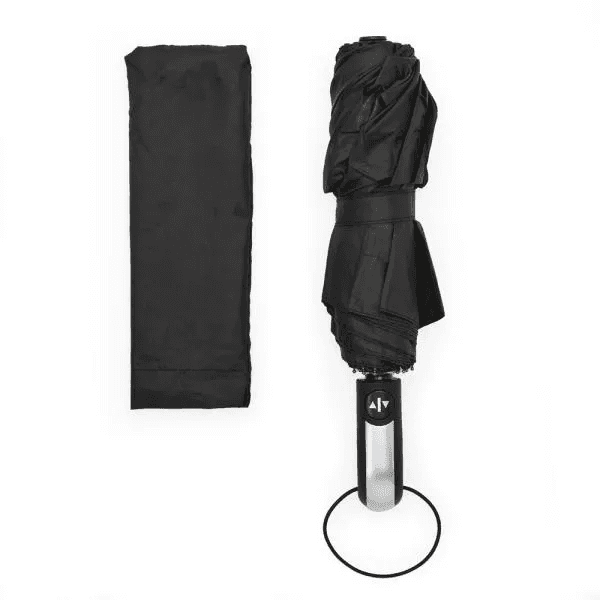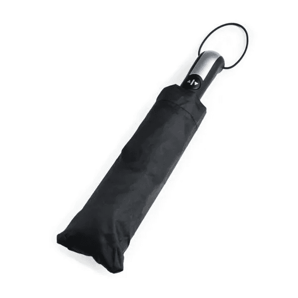 Guarda-chuva confeccionado em Nylon 190T na cor preta. Conta com ativação automática ao pressionar um botão, tanto para abrir quanto para fechar; empunhadura confortável com elástico para fixar no pulso, diminuindo o risco de queda e aumentando a segurança; fechamento em velcro; capa em Nylon para melhor proteção e durabilidade.
