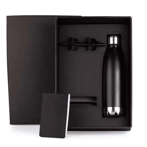 Kit bloco para anotações e acessórios. Conta com garrafa em aço Inox preta com tampa rosqueável; bloco para anotações preto e caneta esferográfica em ABS preta.