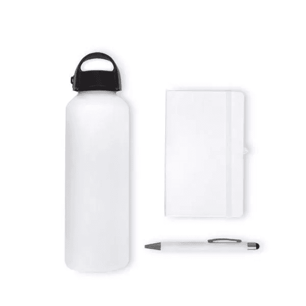 Kit boas vindas. Conta com garrafa branca em alumínio com capacidade de 600 ml; caderno para anotações branco com capa dura e caneta esferográfica em alumínio branca.