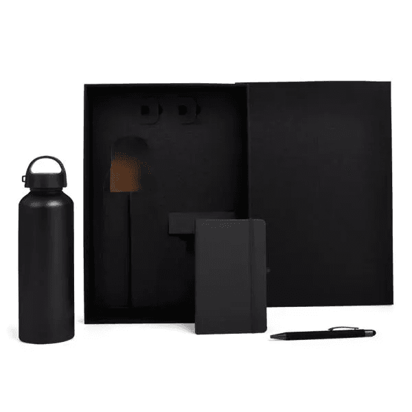 Kit boas vindas. Conta com garrafa preta em alumínio com capacidade de 600 ml; caderno para anotações preto com capa dura e caneta esferográfica em alumínio preta.