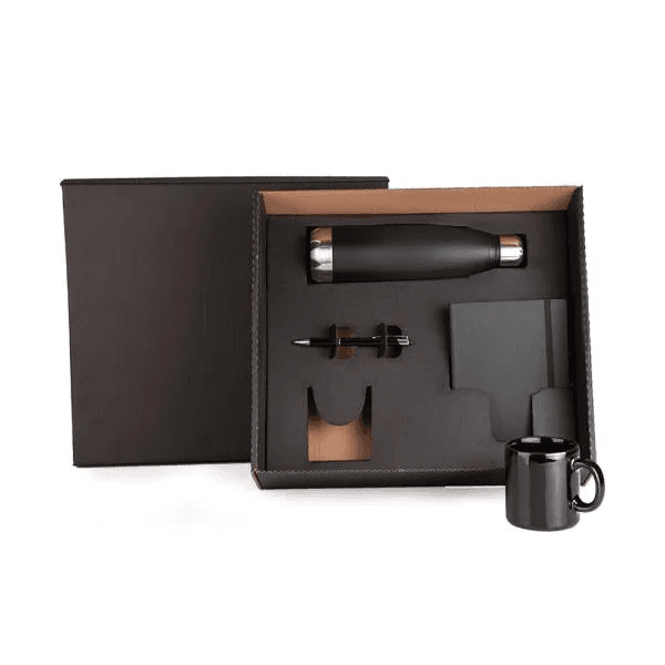 Kit composto por garrafa em aço Inox preta com tampa rosqueável, caneca em cerâmica preta, caderno para anotações preto com capa dura e caneta esferográfica em alumínio preta.