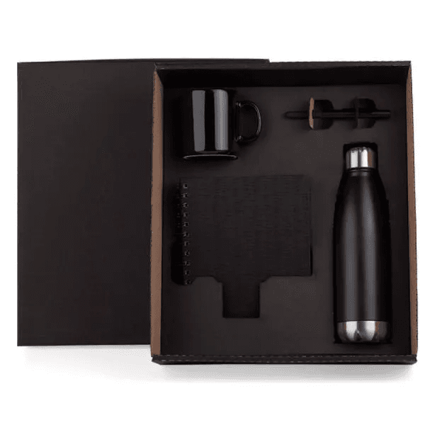 Kit composto por garrafa em aço Inox preta com tampa rosqueável; caneca em cerâmica preta; caderno para anotações wire-o preto com capa dura revestida em percalux linho e caneta esferográfica em ABS preta.