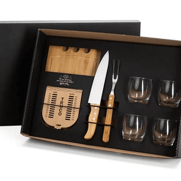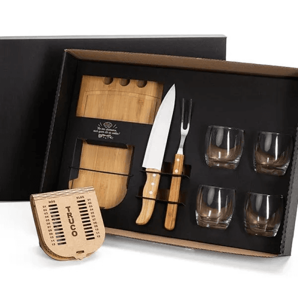 Kit Churrasco, Whisky e Truco. Composto por tábua com três furos em Bambu; garfo trinchante e faca 8" em Madeira/Inox; quatro copos de Whisky em vidro; caixa para truco com jogo de cartas, marcador de tentos e jogos em MDF. Como cortesia, na faca 8" fazemos uma gravação com os cortes do boi.