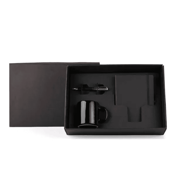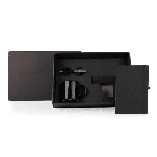 Kit composto por caneca em cerâmica preta; caderno para anotações preto com capa dura e caneta confeccionada em metal cromado brilhante com corpo revestido em material sintético preto texturizado.