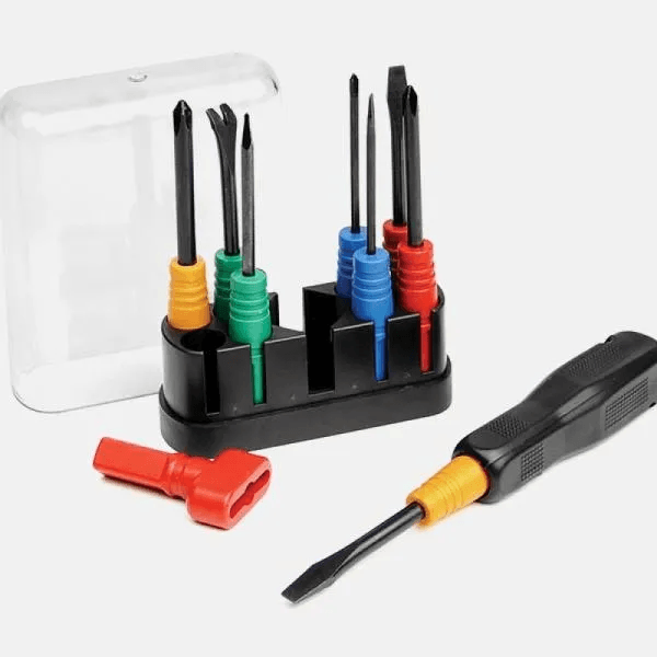 Kit composto por oito ferramentas em aço, sendo três chaves de fendas, quatro chaves philips e um extrator de pregos, todas com cabos em polipropileno, acomodados em um estojo com base preta e tampa em acrílico. Possui ainda um cabo para fixação das chaves e soquete em polipropileno adaptável para porcas borboletas.